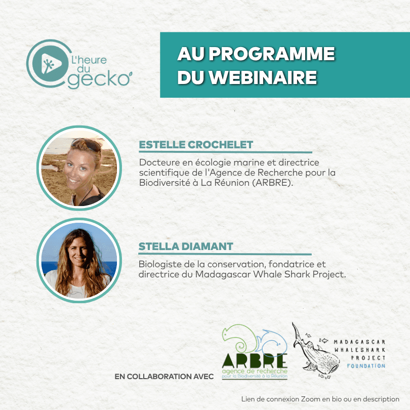 L’heure du Gecko, votre webinaire gratuit et accessible à tous, consacré à la biodiversité de l’océan Indien, revient le jeudi 23 avril. Ce mois-ci, zoom sur les raies et les requins de la région. Que nous apprend la science sur ces espèces fascinantes ? Que reste-t-il encore à découvrir ? Comment les citoyens peuvent-ils aider à mieux les étudier et les protéger ? Estelle Crochelet, directrice scientifique de l’Agence de Recherche pour la Biodiversité à La Réunion (ARBRE) et de l’Observatoire des élasmobranches de l’archipel des Mascareignes (MAEO), ainsi que Stella Diamant, fondatrice et directrice du Madagascar Whale Shark Project, partageront leurs travaux de terrain et leurs observations : étude des espèces dans leur milieu naturel, science participative, mais aussi enjeux et conflits entre développement touristique et préservation des écosystèmes… Elles répondront en direct à vos questions et aborderont bien d’autres aspects de ces espèces encore largement méconnues.